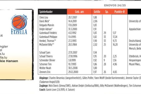 Auf der Transferseite waren die Verantwortlichen der Etzella gezwungenermaßen sehr aktiv. Das Karriereende von Yann Wolff („ein herber Verlust“) und die Abgänge von Jimmie Taylor und Quatarrius Wilson ließen keine andere Wahl. Nachdem einige potenzielle Neuzugänge die Probezeit nicht bestanden hatten, fiel die Wahl auf Nick Davis, der zuletzt in der schwedischen Basketligen spielte, und Adrian Delph, der in Brasiliens Topliga NBB auflief. Dazu holte man Routinier Billy McDaniel von Walferdingen und Tim Schomer von Heffingen. Vom Spielstil her wird sich in Ettelbrück einiges ändern. Eine Rückkehr zu der alten Etzella ist wahrscheinlich. Weniger Physis unter dem Korb – das Fehlen von Wolffs Rebounding wird spürbar sein – dafür mehr Gefahr von außen. Mit McDaniel und Schomer hat man zwei ausgewiesene Shooter verpflichtet.