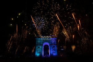 Frankreich, Paris: Während der Neujahrsfeierlichkeiten auf den Champs Elysées in Paris, Frankreich, wird eine Ton- und Lichtshow auf den Arc de Triomphe projiziert