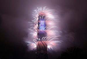 Taiwan, Taipei: Ein Feuerwerk explodiert vor Taiwans höchstem Wolkenkratzer Taipei101, um das neue Jahr einzuläuten