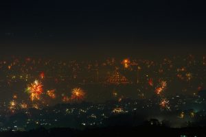 Indonesien, Bandung: Die Al-Jabbar-Moschee ist vom Berg Batu aus während der Silvesterfeierlichkeiten zu sehen