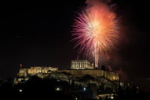 Griechenland, Athen: Feuerwerkskörper explodieren über dem antiken Parthenon-Tempel auf dem Akropolis-Hügel während der Neujahrsfeierlichkeiten
