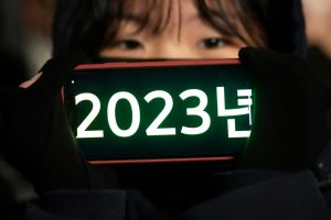 Südkorea, Seoul: Eine Frau hält ihr Smartphone mit der Aufschrift 2023 in der Hand, während sie das neue Jahr vor dem Bosingak-Pavillon zelebriert, wo die jährliche Neujahrsglocke geläutet wird