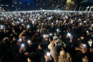 Südkorea, Seoul: Menschen leuchten mit ihren Smartphones, während sie den Silvesterabend vor dem Bosingak-Pavillon feiern, wo die jährliche Neujahrsglocke geläutet wird