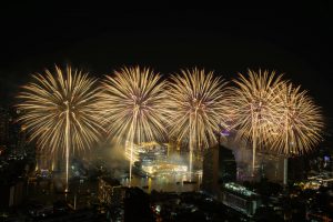 Thailand, Bangkok: Feuerwerkskörper explodieren über dem Chao Phraya Fluss während der Neujahrsfeierlichkeiten