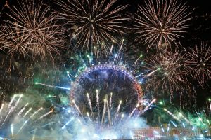Großbritannien, London: Feuerwerkskörper explodieren während der Silvesterfeier über dem London Eye, um das neue Jahr zu begrüßen
