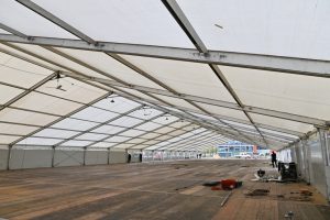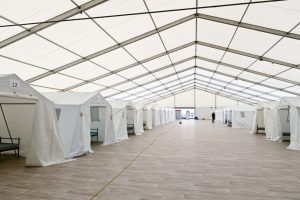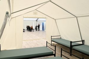 Auf dem Grundstück des „Fonds Kirchberg“ ist auf einem Hektar innerhalb von einer Woche eine kleine Zeltstadt entstanden: mit zwei größeren Schlafzelten von etwa 90 beziehungsweise 60 Metern Länge, einer etwa 30 Meter langen Unterkunft zur Essensversorgung sowie einem zweistöckigen Sanitärzelt von etwa 30 Metern Länge. Um alles etwas abzutrennen, stehen in den beiden großen nun 50 kleinere Zelte – mit je zwölf Einzelbetten darin. 600 Betten sind es insgesamt. „Zwischen 400 und 500 Menschen können hier unterkommen und, wenn es erforderlich ist, auch mehr“, erklärte Jean Asselborn vor Ort und wies darauf hin, dass die Zelte beheizbar und klimatisiert sind. Voraussichtlich ab Freitag sollen Flüchtlinge in der neuen Erstunterkunft unterkommen können.