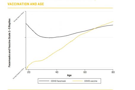 Umgekehrt ist es beim Maskentragen: Die Masken sind vor allem bei den Jüngeren beliebt. Bis zum Alter von 30 werden die Gesichtsbedeckungen allerdings offenbar immer öfter abgelehnt. Erst die Älteren scheinen von Masken wieder überzeugt zu sein.