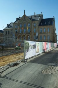 Die Plakate am Bauzaun geben Ideen, wo die Reise hingehen soll. „Platz der Entspannung“, „Platz der Verliebten“ oder „Platz der Musik“ steht darauf. Das Rathaus ist am Ende der Fußgängerzone. Im Büro des Chefs hängt nicht das großherzogliche Paar, wie in vielen Bürgermeisterbüros in Luxemburg, sondern das belgische Königspaar Philippe und Mathilde. Aber die Verbindungen zum Nachbarland spielen eine große Rolle. Das gilt auch für das größte Bauprojekt in der neueren Geschichte der Stadt.