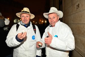 Jos hat einen weißen Schutzanzug übergestreift und trägt einen Mund- und Nasenschutz. Wie Pierre ist auch er zum ersten Mal dabei. „Sie wollen die Menschen zwingen, etwas zu machen, was sie nicht wollen“, sagt er. Warum die Maske? Er wolle andere nicht anstecken, sagt der ehemalige Busfahrer. Er sei nicht geimpft, lasse sich aber regelmäßig testen. „Ich bin Gewerkschafter und im Ruhestand, habe dadurch noch viel Kontakt mit Menschen.“ Seine Informationsquellen sucht er im Internet. Dabei passe er jedoch auf, wo er sich informiere. Das sei nicht unbedingt Facebook, sondern eher öffentliche Quellen.