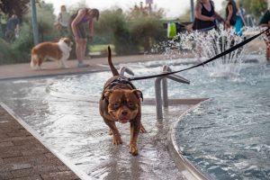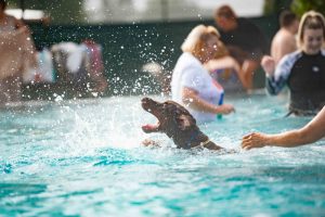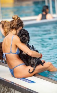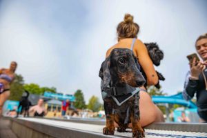 Wer schnell genug gewesen war, konnte am Sonntag zusammen mit dem Hund schwimmen gehen. Bunt war der Badetag auf jeden Fall: Große und kleine Hunde der unterschiedlichsten Rassen, von Mops bis Labrador, planschten im Wasser herum, tummelten sich am Beckenrand oder streckten sich auf der Wiese.
