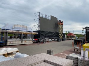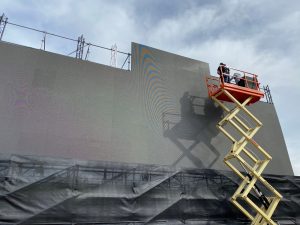 Der Film wird auf einer fast 96 Quadratmeter (15,2 auf 6,3 Meter) großen LED-Bildwand gezeigt. Die rund 800.000 Euro teure Wand besteht aus 133 Elementen und hat ein Gewicht von 3,5 Tonnen. Dazu kommen aber noch etwa 40 Tonnen Ballast, die verhindern, dass der Aufbau selbst bei einem Orkan der Stärke 12 nicht wegfliegt. Vier 40-Tonner brachten das Material nach Mamer. Das Bild hat Full-HD-Qualität, erklärt Niklas Hilger, der für die Installation verantwortliche Techniker der Firma Pro Musik, welche die Leinwand aufstellte.