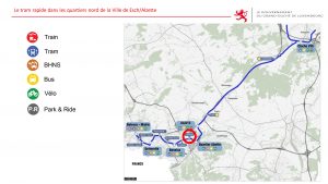 Der Transitverkehr soll also in Zukunft um Esch herumgeleitet werden. Dabei spielt die „Liaison Micheville“ eine große Rolle. Ende 2022, Anfang 2023 soll sie endlich fertig sein, so Straßenbaudirektor Roland Fox. Die Verkehrsknotenpunkte Raemerich, Lankelz, Lallingen/Monkeler werden neu gestaltet, bleiben aber weiter die Zubringer ins Escher Zentrum. Monkeler spielt dabei eine besondere Rolle, denn hier soll ein großes P&R-Parkhaus entstehen für die Pendler in die Hauptstadt. Demnach stehen dem (Grenz-)Verkehr der CFL-P&R in Belval mit Anschluss an die Eisenbahn und der P&R Monkeler mit Anschluss an die schnelle Tramverbindung zur Verfügung. Georges Mischo ist sich jedenfalls sicher, dass all diese Maßnahmen „die Lebensqualität der Escher deutlich verbessern werden.“