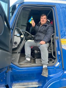 18.00 Uhr: Yaroslav hat ein paar Stunden schlafen können und will los. Er lässt schon mal den Lkw an, der brummelnd und tuckernd seinen Motor auf Temperatur bringt. Es riecht nach Diesel. Zeit für eine letzte Papierkontrolle. „Das muss alles exakt ausgefüllt werden“, seufzt Olga. „Wir mussten alles auflisten, inklusive der jeweiligen Mengen“. Sie wirkt abgekämpft und müde. Als alles zu stimmen scheint, nimmt Yaroslav sich Zeit für ein Foto. Natürlich muss die kleine ukrainische Flagge mit aufs Bild, die sonst über dem Armaturenbrett thront.
