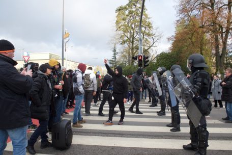 15 Uhr: Die Menschenmasse bleibt auf dem Glacis, hat sich allerdings relativ klar in zwei Gruppen aufgeteilt. Die einen hören friedlich den Rednern und der Musik zu, die anderen stellen sich vor die erste Blockade der Polizisten in Richtung Innenstadt und brüllen sie an. Zwei Polizeidrohnen und ein Helikopter beobachten die Situation aus der Luft. Die Straße in Richtung Kirchberg ist komplett frei. Immer wieder gehen Knaller los, schwarzer Rauch wird vor den Polizisten gezündet und der „Imperial March“ von Star Wars wird durch ein Megafon gespielt.