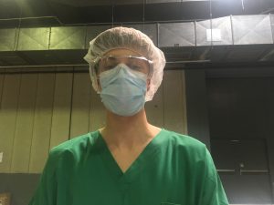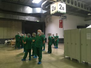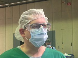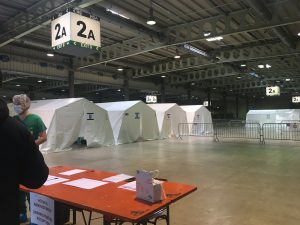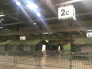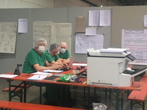 Drinnen herrscht der gleiche unbelebte Eindruck: Menschenleere Gänge und wenn jemand kommt, ist er von oben bis unten „verpackt“. Mundschutz, Brille, Haarschutz und grüne Schutzkleidung lassen alle gleich aussehen. Und wo sonst Stände stehen, befinden sich jetzt Zelte der Armee und des CGDIS. Neonlicht taucht alles in kühle Atmosphäre. Drinnen ist die Stimmung umso herzlicher. Sie ist kollegial, kameradschaftlich, hilfsbereit und gelassen. Alle wissen, was zu tun ist.