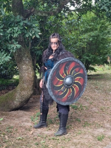 2017 hat sie das Cosplay-Fieber zum ersten Mal gepackt. Seitdem hat sie bereits viele Charaktere dargestellt und an zahlreichen Conventions teilgenommen. Morticia Addams aus der „Addams Family“, John Snow aus „Game of Thrones“, Eddie Munson aus „Stranger Things“ und Trinity aus „Matrix“ sind nur einige der Figuren, in deren Rolle sie bereits geschlüpft ist. „Ende März habe ich zum ersten Mal an einem Cosplay-Wettbewerb teilgenommen“, erzählt sie. Dort trat sie als Prinzessin Serenity aus „Sailor Moon“ auf. „Ich mache so viel selber, wie ich kann, arbeite aber auch gerne mit Secondhand-Kleidungsstücken, die ich dann umnähe oder verziere“, sagt die begeisterte Cosplayerin, die sich das Nähen selber beigebracht hat. „Das bereitet mir am meisten Spaß: Details hinzufügen, hier und da eine Perle draufnähen, aber auch Waffen aus Worbla (thermoplastischer Kunststoff, der sich mittels Hitze verformen lässt, Anm. d. Red.) herstellen.“