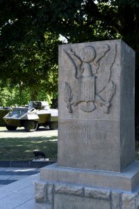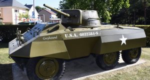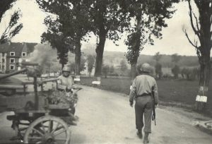 Zurück zum 9. September 1944: Gegen Mittag tauchte der erste Panzerwagen, ein M8, in der rue de l’Eglise auf. Der Spähwagen bewegte sich langsam auf die verminte Brücke zu. Plötzlich wurde das Gefährt von einer Panzerabwehrstellung, die beim Fußballplatz eingerichtet worden war, unter Beschuss genommen. Die Munitionskammer wurde getroffen, der Panzerwagen fing sofort Feuer. Zwei der vier Besatzungsmitglieder sprangen brennend aus dem Fahrzeug und wälzten sich auf dem Boden, um die Flammen zu ersticken. Ein dritter Soldat wurde schwer am Bein verletzt, konnte sich aber ebenfalls retten. Der vierte Insasse des M8, Hyman Josefson, starb im Wrack. Heute erinnert ein Denkmal am Ort des Geschehens an den ersten G.I., der hierzulande sein Leben ließ. Die drei verletzten Soldaten wurden von Sanitätern in ein Lazarett in Frankreich verbracht, zwei von ihnen durften nach ambulanter Behandlung das Krankenhaus wieder verlassen.