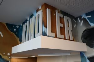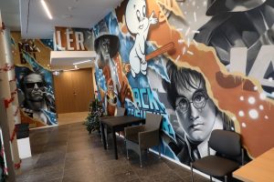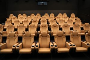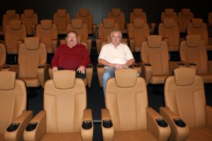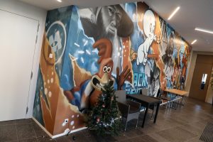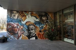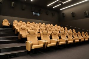 Im Eingang des Kinos begrüßen uns ein Weihnachtsbaum und die Wandmalereien des Künstlers Alain Welter. Auch im Eingangsbereich kann man sie bewundern. Das Kino wirkt heimelig. Man fühlt sich sofort wohl. Links neben dem Eingang befindet sich hinter der Kasse der Vorführraum. Mit 46 Plätzen biete er zwei Schulklassen Platz, so Henri Knuppertz, der Vorsitzende der „Koler Bierger“, der Vereinigung, die den Kinosaal betreibt. Auch ein Behindertenplatz wurde eingerichtet. Die Sessel sind aus Leder und sehr bequem. Das Kino wurde mit der modernsten Technik ausgestattet. „Unser Kino ist eines der einzigen des Landes, das das Soundsystem Dolby Atmos anbietet“, erzählt Knuppertz. Bei dieser Technik kommen die Laute einzeln aus 36 Lautsprechern, die überall im Raum verteilt sind.