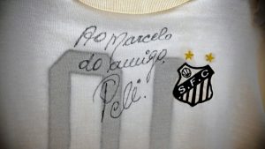 „Ich habe ein Originaltrikot aus dem Jahr 1962. Pelé hat das kurzärmelige weiße Trikot während eines Freundschaftsspiels gegen den belgischen Club Anderlecht getragen und dieses nach Spielende mit einem Spieler von Anderlecht getauscht. Vor einigen Jahren habe ich ihm das Trikot für rund 1.000 Euro abgekauft. Es wurde bislang noch nie gewaschen und enthält immer noch seine Schweißflecken“, so der sichtlich stolze Fan. Auch ein langärmeliges Santos-Trikot, das Pelé 1970 trug und mit seinem Autogramm sowie einer persönlichen Widmung an seinen „Freund Marcelo“ versehen hat, ist Teil der Sammlung. Das Autogramm samt Widmung musste sich der eingefleischte Pelé-Fan allerdings über Bekannte organisieren lassen, da er trotz seiner regelmäßigen Besuche beim FC Santos nie die Gelegenheit hatte, sein Idol persönlich zu treffen. „Meine Ferien verbringe ich immer wieder in Santos. Dort habe ich mit befreundeten Journalisten und Historikern bereits zwei Bücher über Pelé und den FC Santos herausgegeben. Daraus ist der Verein Assophis entstanden. Auf den sozialen Medien erreichen wir mit unseren Beiträgen rund 50.000 Nutzer. Deshalb habe ich mir zum Ziel gesetzt, alles, was ich über Pelé herausfinden kann, mit unseren Followern zu teilen. Diese Arbeit ist wichtig, da meiner Meinung nach mit Pelé nicht nur der größte Fußballer, sondern auch einer der größten Brasilianer aller Zeiten gestorben ist“, sagt der 46-Jährige.