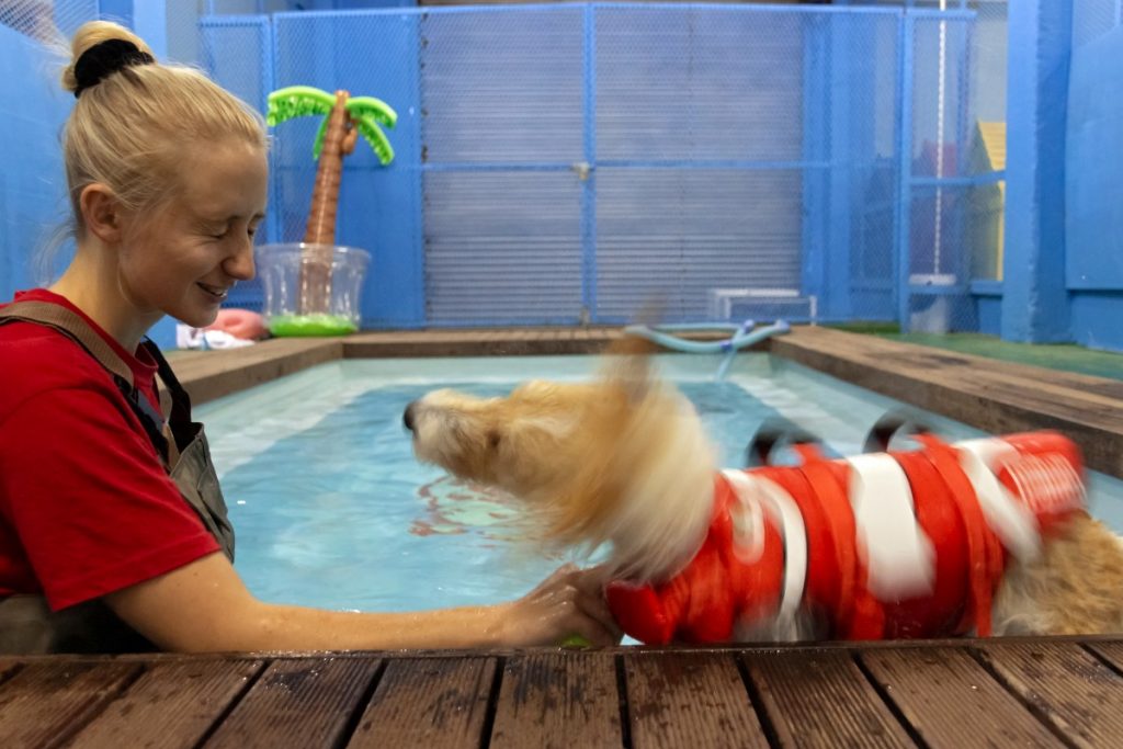 Klue kommt kaum zum Erzählen, während sie durch das Hotel – benannt nach ihrem verstorbenen Hund Frits – läuft. Jeden Gast begrüßt die 35-Jährige überschwänglich. Wie etwa den rot-weiß gefleckten Crookshank, der ein Sonnenbad auf dem Katzenspielplatz nimmt. Im Untergeschoss zeigt die Chefin, weshalb sie das AtFrits auch als Rehazentrum versteht. Im Pool macht die Tiertherapeutin Tineka Kriel Schwimmübungen mit der Terrierdame Clara. Das helfe bei der Rehabilitation nach Verletzungen oder Operationen, erklärt sie.