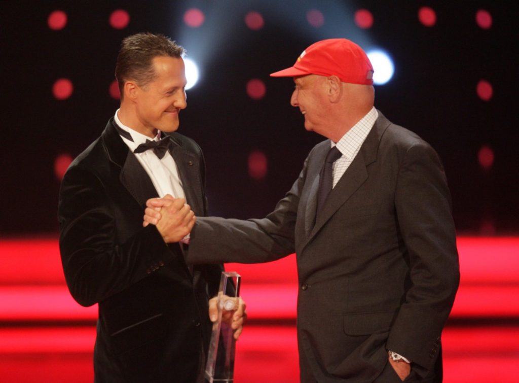 September 2007, Nordrhein-Westfalen, Köln: Der frühere Formel 1-Rennfahrer Michael Schumacher (l) erhält den Deutschen Fernsehpreis in der Kategorie «Sonderpreis» von Ex-Rennfahrer Niki Lauda.