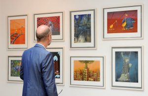 Viele Werke des Argentiniers sind Einbild-Witze. Etwa die steil aus dem Meer aufragende Insel, auf der sich nur ein Fußballfeld befindet. Die Spieler schauen den Abhang hinunter, der Ball liegt tief unten im Wasser. Oder das schwer verliebte Paar: eine Giraffe und ein Elefant. Dahinter läuft eine genervt dreinschauende Giraffe, die sich einen Elefantenrüssel umgebunden hat, um dem Artgenossen zu gefallen – vergebens.