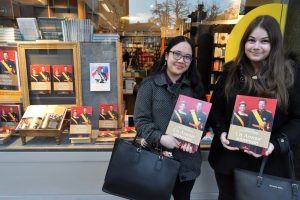 Diese kommt pünktlich um 15.00 Uhr in der „Librairie Diederich“ an, begrüßt freundlich das wartende Volk und setzt sich dann in den Teil des Geschäfts, in dem normalerweise die Luxemburgensia stehen und die Bestellungen aufgegeben werden. Vorteil: Der Raum ist von hinten nicht betretbar und hat einen Notausgang. Der wird freilich am Donnerstag nicht gebraucht, denn es sind an diesem Nachmittag wohl ausnahmslos Bewunderer der großherzoglichen Familie vor Ort. So auch Jael und Sandra aus Esch. Jael trägt ein T-Shirt mit dem Konterfei des großherzoglichen Paares. Nein, Fan von den beiden sei sie nicht, „aber ich bin ein Fan von ihrer Arbeit“. Damit meint sie auch den Einsatz der Großherzogin gegen sexuelle Gewalt in Kriegs- und Konfliktgebieten. Der Erlös des Buches geht nämlich an ihre „Stand Speak Rise Up!“-Vereinigung.
