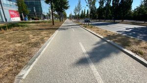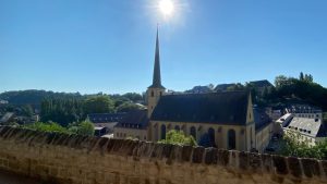 Von Hesperingen geht es entlang der Alzette auf dem Rad- und Spazierweg in Richtung Luxemburg-Stadt, besser gesagt Grund. Die 10 Kilometer sind ein Genuss, auch weil die vielen Waldpassagen eine echte Abkühlung an diesem heißen Morgen bringen. Ab der „Polfermillen“ wird der Weg eng und mitunter auch gefährlich. Die Spanplatten an der Behelfsbrücke unmittelbar vor dem Stadtgrund sind an mehreren Stellen aufgerissen und eine echte Zumutung für Radfahrer. Hier sollte man unbedingt absteigen, was bei den engen Passagen sowieso keine schlechte Idee ist.