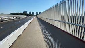 Im Grund angekommen, ist die Versuchung groß, mit einem Pint im Pub den Durst zu stillen. Doch erstens ist es noch recht früh am Tag und zweitens sind erst 15 von 55 km absolviert. So geht es also nach einem Erinnerungsfoto weiter unter dem Bockfelsen hindurch in Richtung Pfaffenthaler Lift. Der ist groß genug für die gesamte Gruppe, die anschließend über die rote Brücke den Kirchberg erreicht. Hier beginnt der außergewöhnlichste Radweg des Landes entlang der Avenue John F. Kennedy. Einer, den man sich als Radfahrer überall im Land wünscht. Denn er verläuft getrennt von der Straße und garantiert mit seiner grünen Welle dem Zweirad die Vorfahrt.
