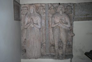 Henri Rasqué von den Geschichtsfreunden Ell macht uns auf eine Kuriosität aufmerksam. Sie befindet sich in der Dorfkirche an der Wand der Taufkapelle. Dort hängen zwei Grabplatten an der Wand, die höchstwahrscheinlich zwei ehemalige Bewohner der Burg darstellen, nämlich Anna von Hondelingen zu Ell und Bernard von Enscheringen zu Ell. Die Grabplatten sind im 19. Jahrhundert anlässlich von Renovierungsarbeiten entdeckt worden. Sie waren mit der Rückseite nach oben in den Boden eingelassen, sodass man darauf gehen konnte. Ein Grund dafür könnte sein, dass man die Grabplatten vor der