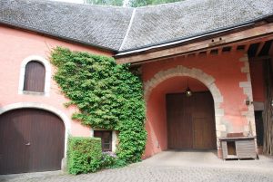 Besitzer. So wurde die Ringmauer später zur Stützmauer für neue Gebäude, die dann auch überdacht wurden. Ein einziger Turm der Burg hat überlebt, wenn auch nicht in Originalhöhe. Anders als von der Straßenseite ist die eckige Grundform vom Innenhof her gut zu erkennen. Der Torbogen ist noch in ursprünglichem Zustand erhalten, ebenso ein Stück der Wendeltreppe, die nach oben führte. Den Torbogen zur Straße hin hat Paul Faber nach altem Vorbild rekonstruieren lassen. Einer der Vorbesitzer hat das Original entfernt und durch einen größeren eckigen Eingang ersetzt, wahrscheinlich um mit dem Heuwagen besser in den Innenhof zu kommen. Bei der beidseitig von einer Mauer gesäumten Zufahrt, die man von der Straße aus sieht, handelt es sich um die Brücke, die zur Burg führte, als diese von Wasser umringt war. Heute ist der Graben, durch den das von der nahen Mühle stammende Wasser floss, zugeschüttet, die Bögen liegen aber immer noch unter der Erde, so Paul Faber. Er wirkt zufrieden und stolz. Zu Recht.