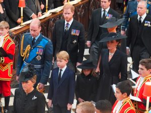 Mit König Charles folgten auch die übrigen Kinder der Queen – Prinzessin Anne, Prinz Andrew und Prinz Edward – im Trauerzug. Dahinter gingen ihre Enkel Prinz William und Prinz Harry. Ihre Ehefrauen sowie Williams Kinder folgten in Limousinen bis zum Triumphbogen Wellington Arch, wo der Sarg von acht Trägern von einer Lafette in den Leichenwagen umgebettet wurde. Auf Windsor schlossen sich die Royals dem Geleitzug erneut an.