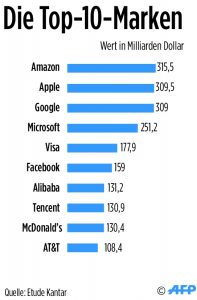 In den Top Ten sind acht US-Unternehmen zu finden – darunter Facebook und Visa sowie die beiden chinesischen Internetriesen Alibaba und Tencent. Der BrandZ Report des Analyseinstituts Kantar beziffert den Markenwert von Amazon auf 315 Milliarden Dollar (278 Milliarden Euro) – ein Plus von 52 Prozent im Vorjahresvergleich.