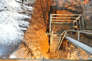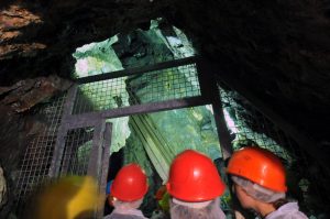 Draußen kratzt die Temperatur an der 28-Grad-Marke, doch in der Mine herrschen frühlingshaft-frische elf Grad. Schon beim Abstieg in den Entwässerungskanal der Kupfermine spürt man bereits nach nur wenigen Metern eine deutliche Abkühlung gegenüber der seit Tagen anhaltenden Hitze. „Das ist der angenehmste Teil meines Ferienjobs“, erzählt Studentin Liviana. In den Sommerferien legt sie im alten Bürogebäude aus den Jahren 1938-1944 Helme und Stiefel für die Besucher bereit.
