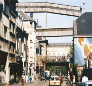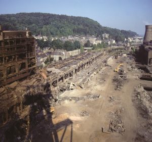Das zweite Kapitel hat viel Ähnlichkeit mit jener Periode, die wir aktuell durchleben. Ab 1973 fand das Wirtschaftswunder ein jähes Ende. Schuld war damals eine Öl- und Energiekrise aufgrund des Nahost-Konflikts. Die Energiepreise schossen in die Höhe. Autobauer, Baustoffproduzenten, die chemische Industrie sowie die Eisen- und Stahlhersteller meldeten überall Kurzarbeit an. Auch die Arbed-Werke in Differdingen blieben davon nicht verschont. Im Gegenteil: Innerhalb von nur wenigen Jahren entschied sich die Direktion zur schrittweisen Schließung von Werken und Produktionslinien. Hochöfen, Kokssilos, Erzhalden und Schweröltanks wurden demontiert. Der letzte Hochofen in Differdingen verschwand 1989. Die stahlverarbeitende Werke wie die Walzwerke verblieben vor Ort. Das benötigte Gas wurde ab 1979 durch eine Gasleitung vom Hochofen C aus Belval nach Differdingen befördert, teilweise quer durch die Wohnviertel, wie man anhand der Fotos deutlich erkennen kann.
