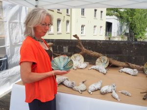 Ausstellen darf jeder maximal vier Mal pro Jahr. Die meisten Künstler finden sich an bis zu drei Sonntagen auf der pittoresken Brücke über der Alzette ein. Auch Jane Plahé hat einen Teil ihrer Werke mit in den Grund gebracht. Bereits von Weitem fallen ihre tönernen Quallen direkt ins Auge, wie sie an Schnüren befestigt leicht im Wind drehen. „Ich mache unterschiedliche Arten von Kunst, diese hier ist einfach und leicht zugänglich. Vor allem Kinder mögen die Quallen sehr, manche nennen sie sogar Aliens“, meinte die Künstlerin schmunzelnd.