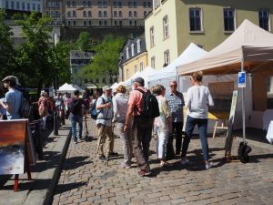 Seit 2006 schon bietet der Luxemburger Grund jedes Jahr Künstlern aus dem In- und Ausland die Möglichkeit, ihre Werke unter freiem Himmel zu präsentieren. Die Open-Air-Ausstellung, die anfangs noch samstags in der rue Saint-Ulric stattfand, ist vor acht Jahren auf die kleine Brücke vor dem Cercle Munster umgezogen und findet nunmehr jeden ersten Sonntag im Monat statt.