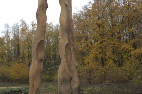 Das Material für die vier bis fünf Meter hohen Skulpturen stammt aus dem Wald. Benutzt wurde Eichenholz, das den Witterungsverhältnissen besser standhält. Wie er zu den verschiedenen Formen kam? Natürlich habe er zuerst Skizzen gemacht, sagt der Künstler. Doch ohne Spontaneität und Überraschungsmomente ging es nicht. Denn schließlich musste man sich an die angelieferten Stämme orientieren. Mit einer Handvoll Mitarbeiter wurden die Skulpturen dann in drei bis vier Wochen erstellt.