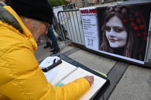 Mit einer stillen Mahnwache versuchten die Anwesenden, ihrer Trauer über den Tod von Mahsa Amini Ausdruck zu verleihen und jener Menschen zu gedenken, die bei den Protesten im Iran verletzt, verschleppt oder getötet wurden. So sollen allein nach Angaben der Menschenrechtsorganisation „Iran Human Rights“ (IHR) bereits mehr als 70 Menschen ums Leben gekommen sein.