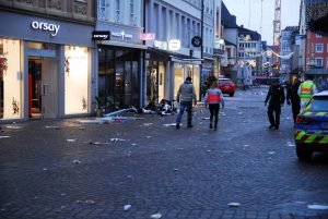 Ermittler suchen nach Spuren, und auch Stunden nach der mutmaßlichen Amokfahrt von Trier sind weite Teile der Fußgängerzone mit weiß-rotem Polizei-Band abgesperrt. Wo das Auto entlang gerast sein muss, liegen an diesen grauen Dezember-Tag wahllos Dinge auf der Straße. Die Polizei spricht von fünf Toten, darunter ein neun Monate altes Kind. Die Mutter liegt verletzt im Krankenhaus. Festgenommen wird ein 51 Jahre alter Deutscher aus dem Kreis Trier-Saarburg.
