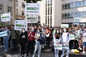 „Merci“ steht auf Schildern und auf den vielen Fensterscheiben des Schulgebäudes. Das Dankeschön gilt den „School Heroes“. Die Pandemie, so Patrick Engel, habe gezeigt, wie wichtig und „systemrelevant“ verschiedene Berufe sind. Das medizinische und paramedizinische Personal, Polizei, Feuerwehr und Rettungskräfte. Ihnen habe man Anerkennung gezollt, zumindest am Anfang, mit Beifallkonzerten am Abend. „Eine Berufsgruppe ist aber selten erwähnt worden, obwohl sie ganz viel Arbeit leisten und Verantwortung tragen musste und immer noch muss, nämlich das Schulpersonal.“