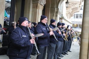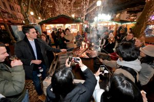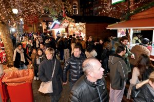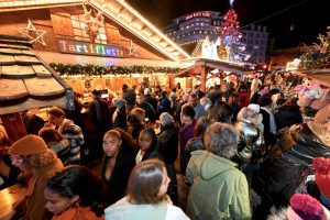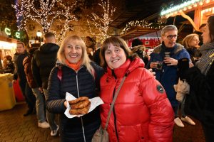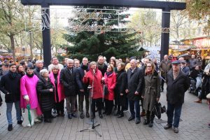 Die „Tramsmusek“ begleitete die Feierstunde mit weihnachtlichen Noten und sorgte für gute Stimmung. Die Ansprache von Bürgermeisterin Lydie Polfer war kurz und freudig: „Endlich wieder ein normaler Weihnachtsmarkt ohne Einschränkungen und ohne Pandemie.“ Mit Dankes- und Lobesworten an alle Akteure, die die diesjährige Auflage ermöglicht haben, schaltete die Bürgermeisterin mittels Betätigen des roten Buzzers die Beleuchtung am Eingang des „Stater Chrëschtmaart“ ein. Zu ihrer Seite gesellten sich die Schöffen- und Gemeinderatsmitglieder sowie Familienministerin Corinne Cahen.