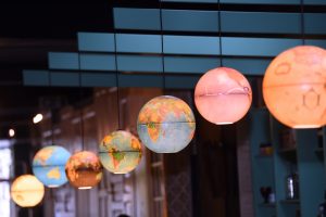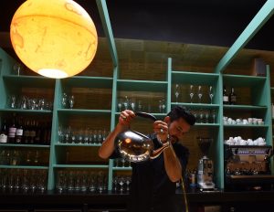 „Die Migranten wurden von der Musik gerufen“, erklärt Dickes ihren Ideengang bei der Einrichtung weiter. „Sie reisen um die Welt, auf der Suche nach einem Punkt, an dem sie sich niederlassen können.“ Diese Musik wird durch die alten Partituren hinter der Bar symbolisiert. Dickes stellt sich vor, wie Meerjungfrauen im offenen Meer rufen. Die Lichter der Bar bestehen aus verschiedenen Globen. Dahinter zaubert Tom Herber am Abend kreative Cocktails, die zum After-Work einladen.