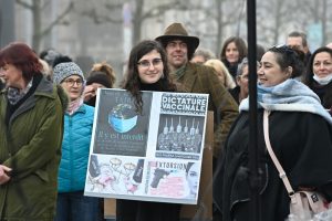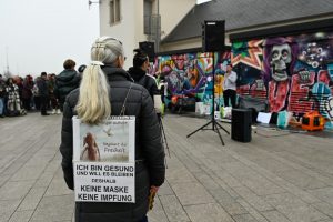 Es ist das schon gewohnte Bild: Ein Grüppchen Leute steht am Glacis in der Nähe der öffentlichen Toiletten, um gegen die Corona-Maßnahmen der Regierung zu demonstrieren – ohne Maske, aber mit allerlei Schildern, auf denen diffuse Theorien und Sprüche stehen.