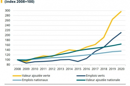 Der Beitrag der grünen Wirtschaft zum nationalen Bruttoinlandsprodukt (BIP) lag lange Zeit bei rund 1,7 Prozent – seit 2018 ist er jedoch deutlich gestiegen und hat 2020 3 Prozent des BIP erreicht. „Die grüne Beschäftigung und die grüne Wertschöpfung sind also seit 2017 schneller gewachsen als die Gesamtwirtschaft“, schreibt Statec. So stieg die Zahl der grünen Arbeitsplätze zwischen 2008 und 2020 um 35 Prozent.