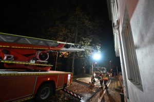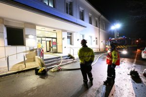 Aus Zimmer 13 sind Husten und Schreie zu vernehmen. Wenig später rollt ein Krankenpfleger mit Atemschutz das Krankenbett mit seinem Patienten aus dem Zimmer. Die Türfugen werden mit einem nassen Tuch abgedichtet, damit sich der Rauch nicht im Flur weiterverbreitet. „Ein Rollstuhl für die Zehn“, schreit ein Pfleger. Wenig später wird eine Frau in Sicherheit gebracht. „Neun und Zehn sind gut“, meldet ein anderer Pfleger die abgeschlossene Evakuierung des Seitenflügels, in dem das Feuer entstand.