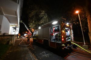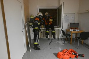 In der Zwischenzeit machen sich zwei Feuerwehrmänner in voller Montur auf den Weg nach oben ins zweite Stockwerk. Gleich nach dem Alarm hatte die hauseigene Feuerwache die Feuerwehr alarmiert. Knapp zehn Minuten später sind die Wehren aus Düdelingen und Bettemburg mit zwei Löschwagen, einer Drehleiter und einem Krankenwagen vor Ort. Unter großer Kraftanwendung schleppen die zwei Feuerwehren Schläuche und Löschlanze durch die Fluren der zweiten Etage.