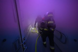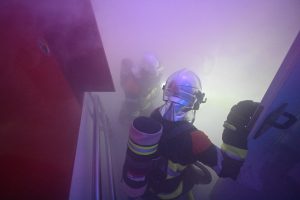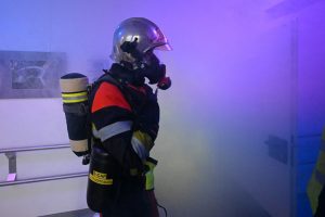 Bis zu 25 Kilogramm trägt jeder der Helfer. Dann der erste Versuch, den Brandherd in Zimmer 13 zu löschen. Doch wenige Sekunden später torkelt einer der Feuerwehrleute aus dem Zimmer. Sein Atemschutz ist defekt. Der Kollege begleitet ihn. Ein schrilles Alarmsignal ertönt, ausgelöst von einer kleinen Sirene an der Uniform des Feuerwehrmanns. Er soll die anderen Kollegen durch die dichten Schwaden zum Verletzten heranlotsen. Priorität hat jetzt die Hilfestellung für den verletzten Feuerwehrmann. Rasch ist Hilfe vor Ort. Ein zweiter Versuch, das Feuer von innen zu löschen, wird nicht unternommen. Die Feuerwehrleute verlassen die Etage, nachdem sie nochmals alle Zimmer auf eine mögliche Anwesenheit von Menschen kontrolliert haben.