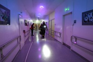 Währenddessen wird ein anderer Patient auf seinem Bett durch den Flur geschoben. Endlich ist offenbar auch der Bewohner von Zimmer 21 aus der Gefahrenzone. An den Türen der leeren Zimmer hängt eine rote Plakette „salle évacuée, défense d’entrer“. Ein letzter Rundgang durch den Flur, eine letzte Kontrolle. Keinesfalls überflüssig. Der widerspenstige Patient aus der 21 hat sich unbemerkt zurück in den Schrank geschlichen. Die mühselige Überzeugungsarbeit beginnt von vorn.
