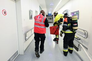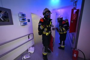 Kurz nach halb sieben am Mittwochabend im CHEM Düdelingen, zweiter Stock. „Feuer in der 13“, ruft eine Krankenpflegerin und läuft zu einem gelben Wandkasten im Flur, dem sie unter anderem eine Gelbweste entnimmt. Weiße Rauchschwaden wabern durch die Türfugen von Zimmer 13. Der Rauch stammt aus einer Nebelmaschine. In der CHEM-Zweigstelle, spezialisiert auf Altersheilkunde und Reha, wird der Notfall geübt.